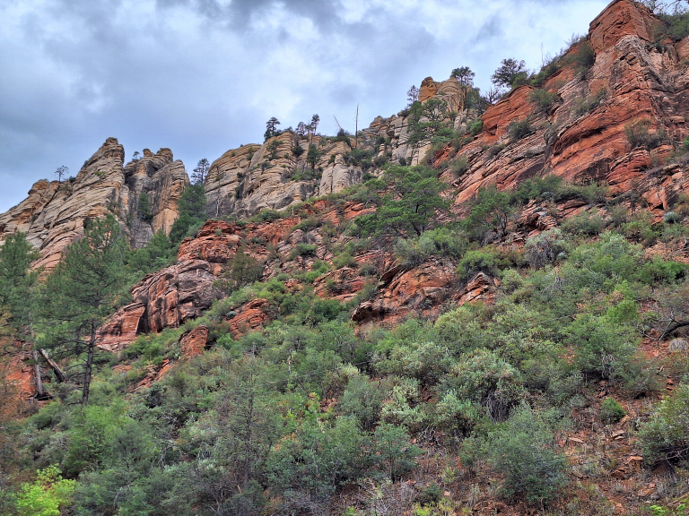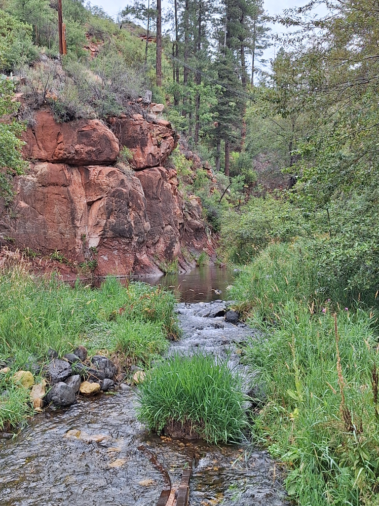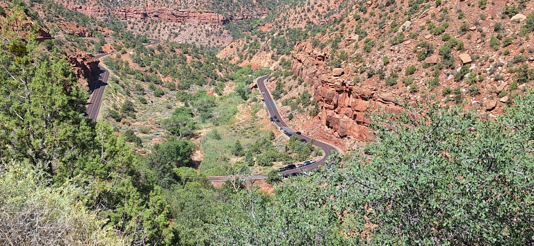 Zurück in Flagstaff, führt uns der Highway 89A durch eine enge und steile Schlucht hinunter nach Sedona. Am Grund der Felsenwände wächst dichter Wald. Im Schatten der Bäume ist eine Lodge an der anderen, alle haben das gleiche Geschäftsmodel, kühler Schatten! Beim Montezuma Castle NM können wir uns wieder eine Indigene Festung hoch in den Felsenwänden anschauen. Die einfacheren Bauten der Bauern in der Umgebung sind nicht mehr sichtbar, ein Vorteil der Adobe Bauten. Ein Katzensprung entfernt, hinter Clarkdale schon das nächste NM. Wieder zeugt es vom Willen, die Quellen zu schützen und wenn nötig mit Festungen zu sichern. Haben die Tuzigoot etwa von den herannahenden Spanier gehört und wollten vorbereitet sein? Eine Spekulation? Seis drum, der Campground hat Dusche und das entscheidet.