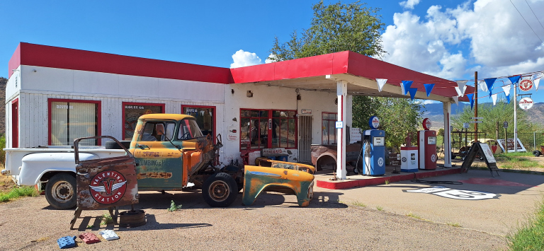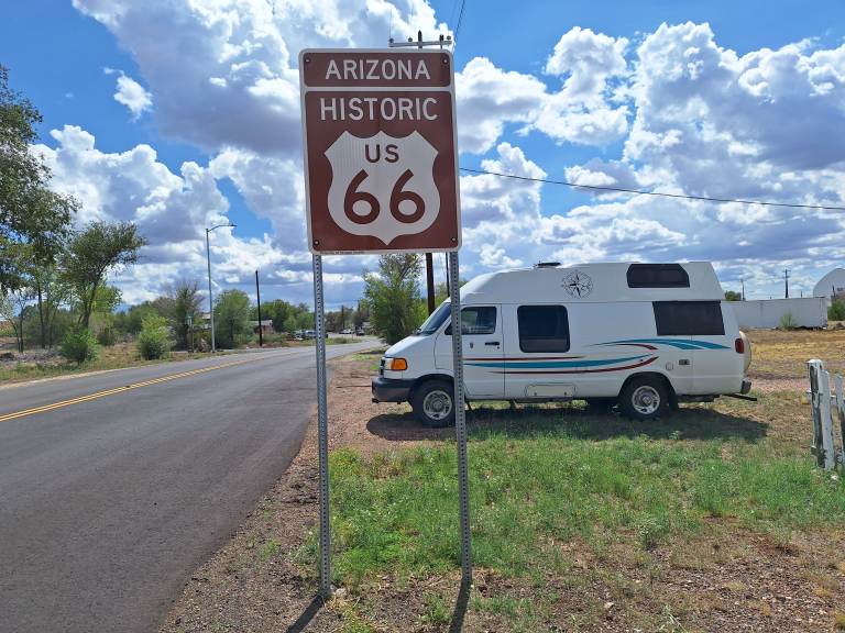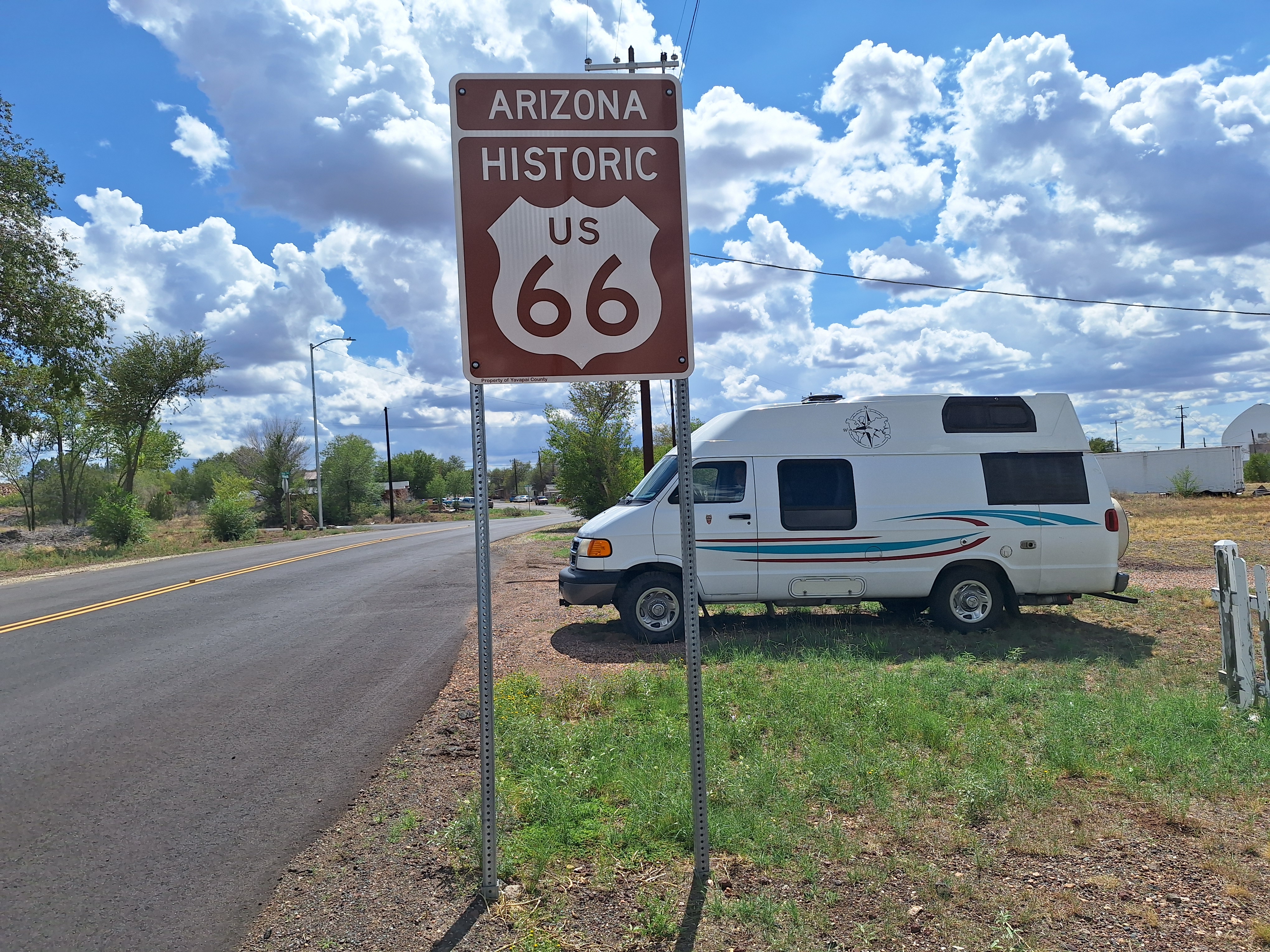 Jetzt fahren wir wieder nach Norden, bis Ash Fork. Vielleicht heisst der Ort so, weil sich die Santa Fe Railway und die schon lange wieder stillgelegte Phönix Railway begegneten? Die Dampfloks werden kräftig Asche gespuckt haben. Aber die Santa Fe hat überlebt und die Züge rollen in ihrer ungewohnten Länge durch die Wüste. In etwa diesen Geleisen entlang, bis nach Kingman, führt das längste noch erhaltene Teilstück der Route 66! Auf der Mutter aller US Strassen darf man von vergangenen Zeiten Träumen und in den gebliebenen Dörfern sein Geld ausgeben und das nicht zu knapp! Noch lebt die Legende dank der vielen älteren Touristen weiter, wird die Zeit sie einholen?