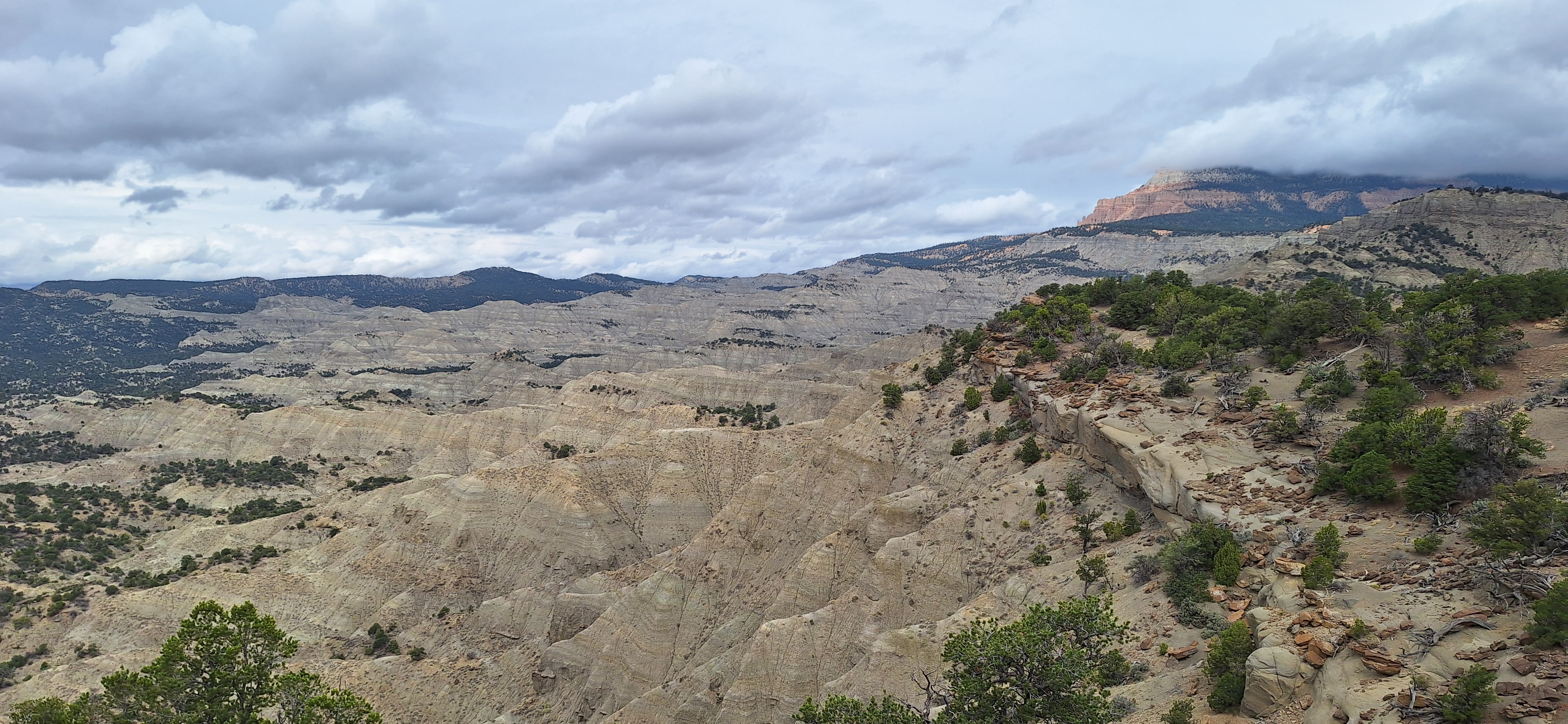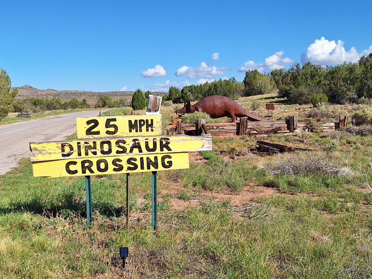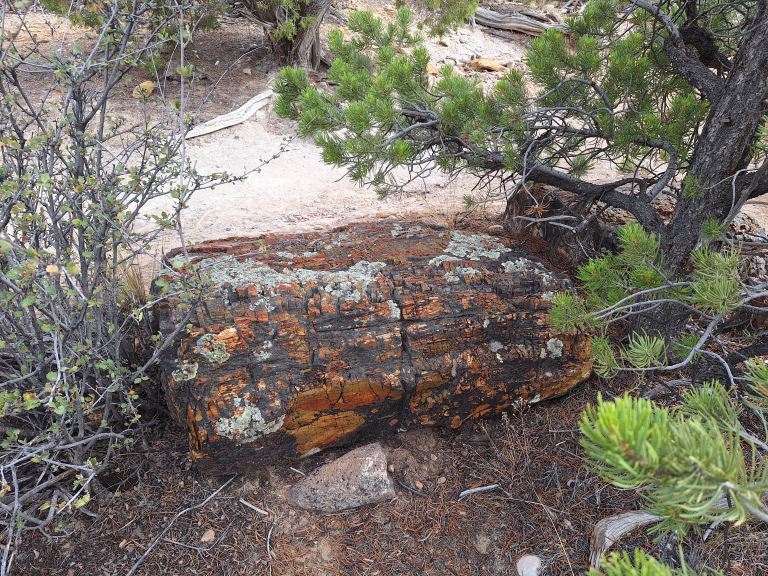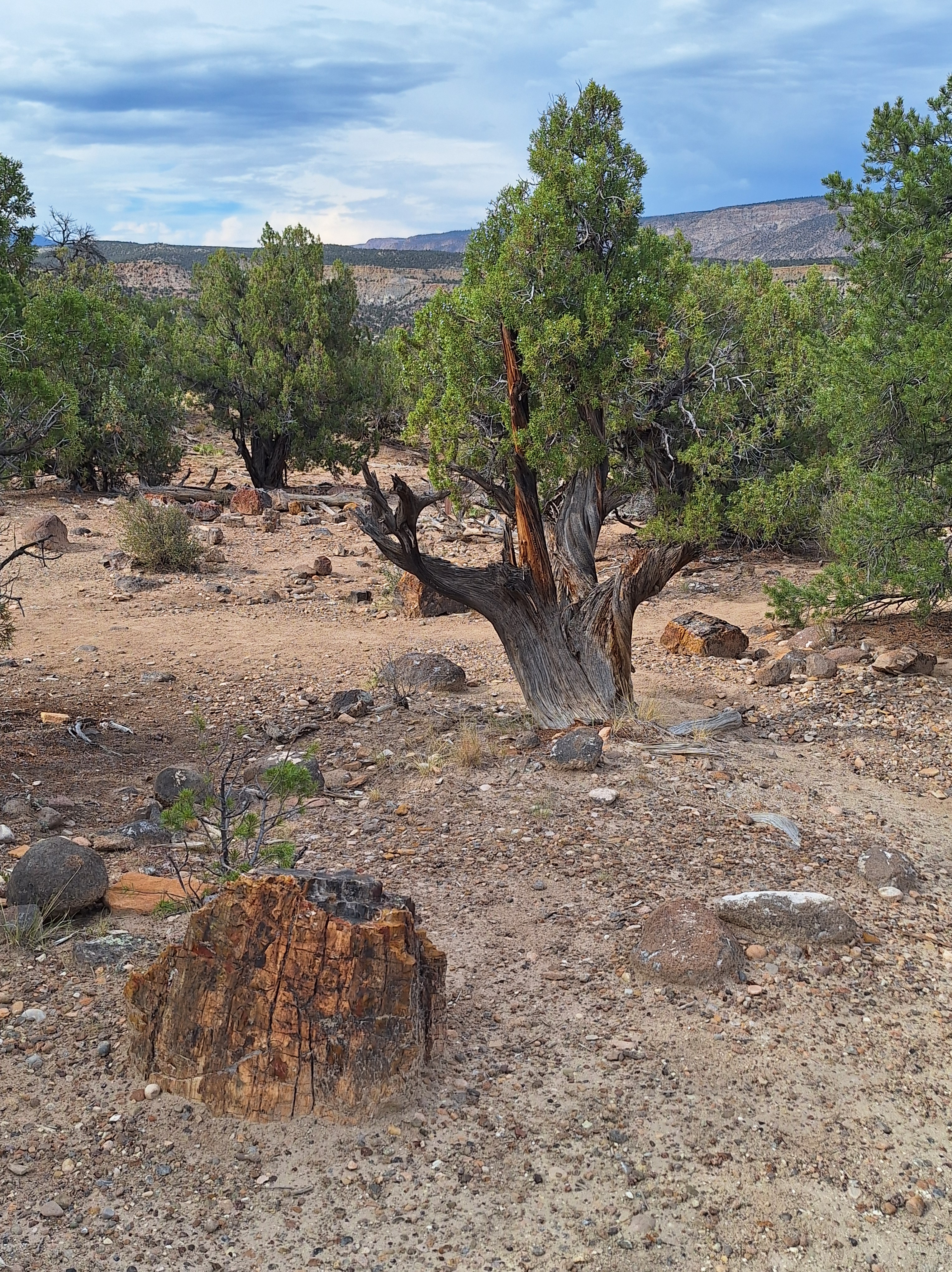 Das Wetter hat sich beruhigt und wir geniessen die Fahrt über die Boulder Mountains und den 3000 MüM liegenden Pass. Beim Dorf Boulder besuchen wir das Anasazi State Museum mit feinen Arbeiten der frühen Indigenen Kultur. Die Anschliessende Fahrt über den Head of the Rocks hinunter nach Escalante ist toll. Hier können wir Einkaufen und ein sehr netter Garagist wechselt den festgeklebten Ölfilter. Es gibt eine rechte Sauerei und natürlich ein abschätziges Kopfschütteln über die eigene Zunft. Danach suchen wir uns ein Plätzli im nahen Petrified Forest State Park. Da sich das Wetter von der guten Seite zeigt, unternehmen wir noch einen Marsch hinauf in die Welt der versteinerten Bäume. Dabei macht sich mein Knie unerfreulich bemerkbar, ich hoffe und greife zu Salbe und Tabletten.