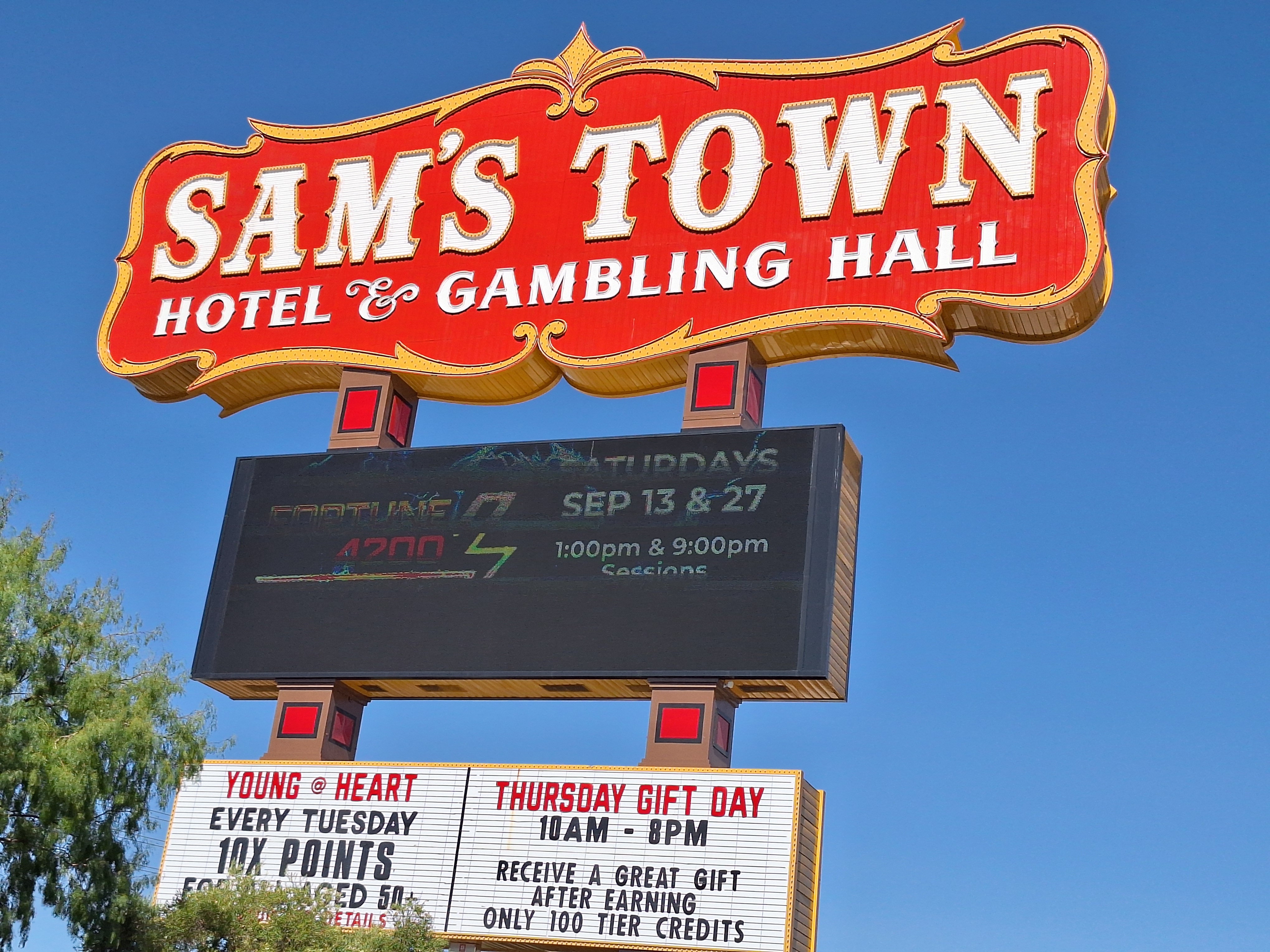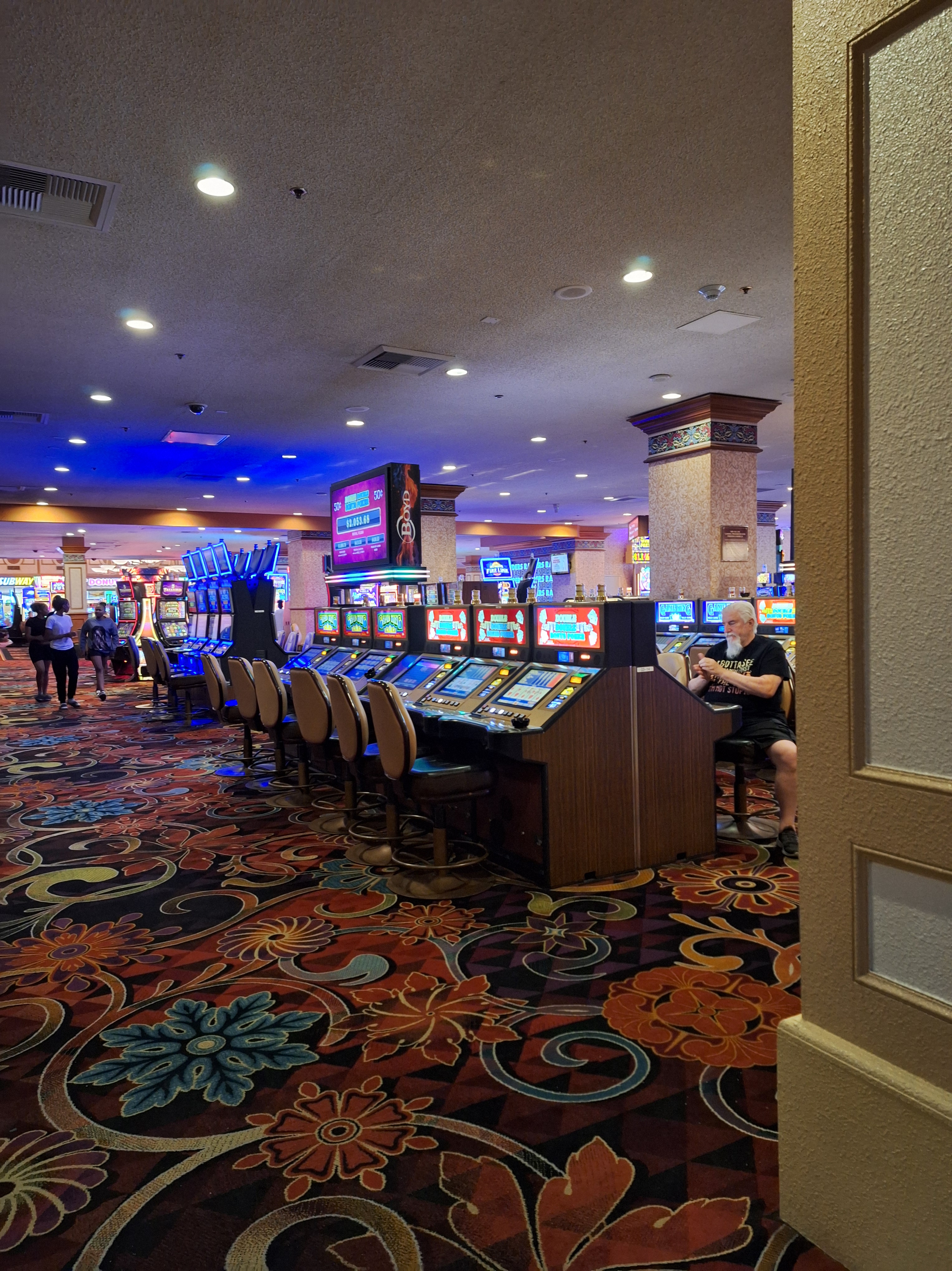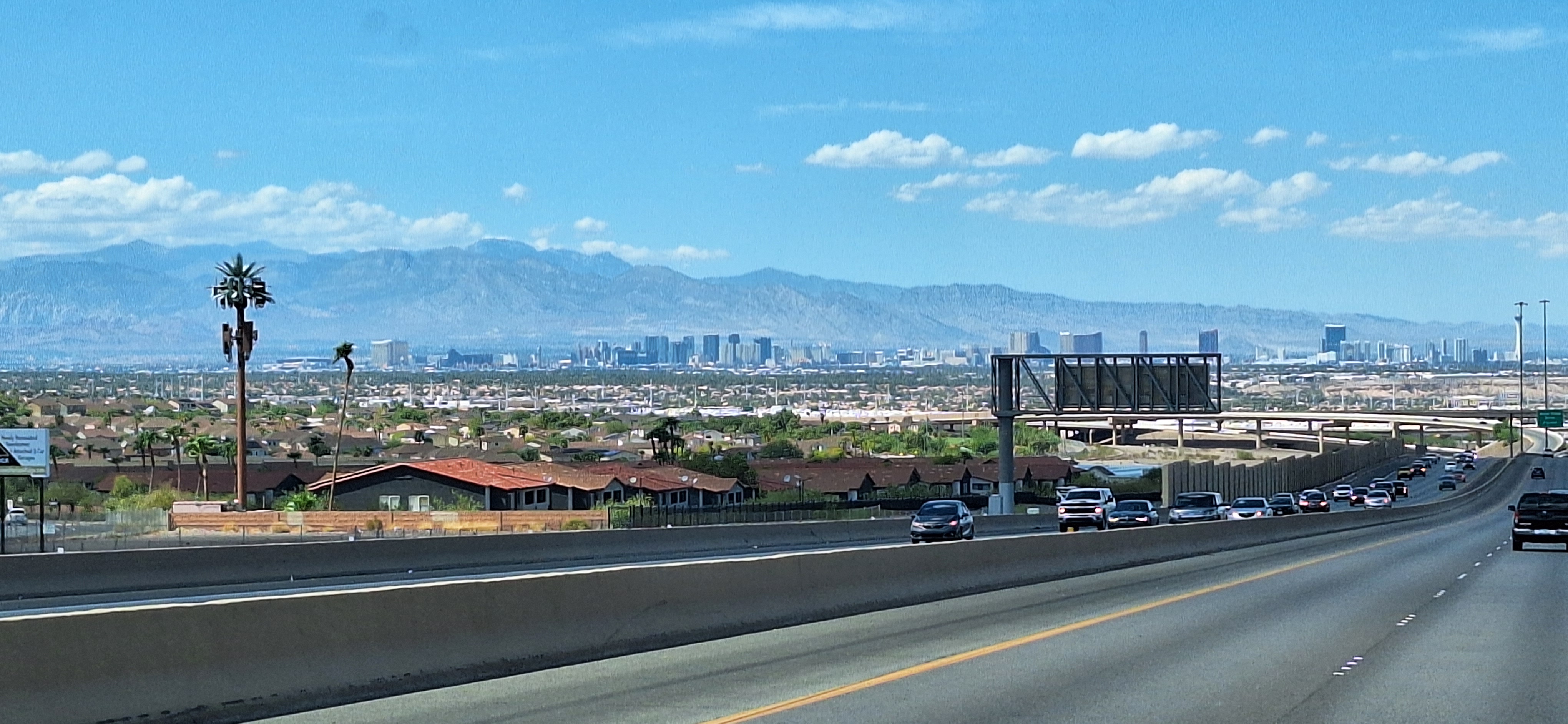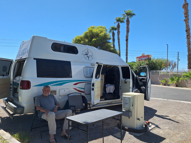 Am Vormittag sind wir zurück auf dem KOA Platz. Hängen unsere Reservation ins Autofenster und leeren den Gülletank. Unvorstellbar, aber im Winter kann es auch in Las Vegas frieren, also müssen wir das Wassersystem, Boiler etc. Winterfest machen. Danach werfen wir uns in unsere besten Reiseklamotten und waschen die noch angetragenen. Angespannt fahren wir die letzten 12km zum Einstellplatz für das Auto. Mit etwas Mühe finden wir den “Selbstbedienungsplatz”. Mit dem Code öffnet sich das Tor und Dodgli wird auf Platz 47 abgestellt. Schnell den Bettinhalt zentral im Bett aufgetürmt um die Wohnraumbatterie erreichbar zu machen. Beide Batterien abhängen, alle Fenster mit Folie schattieren und Türen abschliessen nicht vergessen! Vor der Anlage versuchen wir ein Taxi zu rufen, aber bald stellen wir fest, dass kein Wagen kommen wird. Wir entsprechen nicht dem Profil der Taxiunternehmer in Vegas, vermutlich haben sie Angst, dass wir kein Geld haben. So versuchen wir gegenüber in einer Anlage mit Wohnapartments unser Glück. Eine sehr nette Mitarbeiterin im Immobilienbüro bestellt dann für uns ein Taxi aus dem Viertel. Wir sind sehr froh über diese Hilfsbereitschaft! Klimatisiert dürfen wir in ihrem Büro die 15 Minuten warten, nochmals herzlichen Dank! In flotter Fahrt werden wir in Sam’s City Hotel und Spielhalle gebracht und wollen so schnell wie möglich auf unser Zimmer. In einem der 8 Restaurants, fast tiefgekühlt und in Faserpelz gehüllt, nehmen wir noch ein feines Abendbrot zu uns, danach haben wir nur noch einen Wunsch, Schlafen.