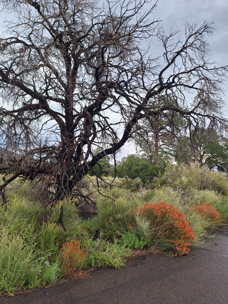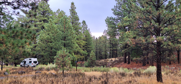 Entlang der roten und fast weissen Vermillion Cliffs kommen wir nach Kanab, einem von Touristen geprägten Ort. Hier steht in Leuchtschrift auf einer Tafel an der Strasse, dass die North Rim am Grand Canyon zu erreichen sei. Mit neuen Reifen an den Vorderrädern machen wir uns durch den Kaibab National Forest auf den Weg. Dem Dodgli scheinen die neuen Finken zu behagen, es geht flott voran. Wir haben von den verehrenden Wildfires der vergangenen Wochen gehört und ja, es ist je nach Lage sehr schlimm! Aber es sind auch Täler mit schönem Pinienwald, die verschont wurden. Also eine abwechslungsreiche Fahrt an die Nordseite des Grand Canyon. Zumindest bis drei Meilen vor die Rim, da ist die Strasse gesperrt und der Ranger nötigt uns zur Umkehr. 30 Meilen zurück, in Jacob Lake (den wir nie sehen) beschliessen wir den Reisetag.