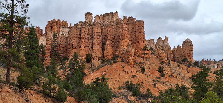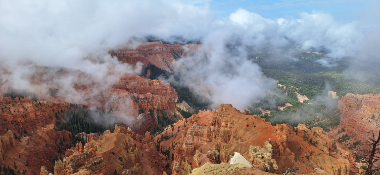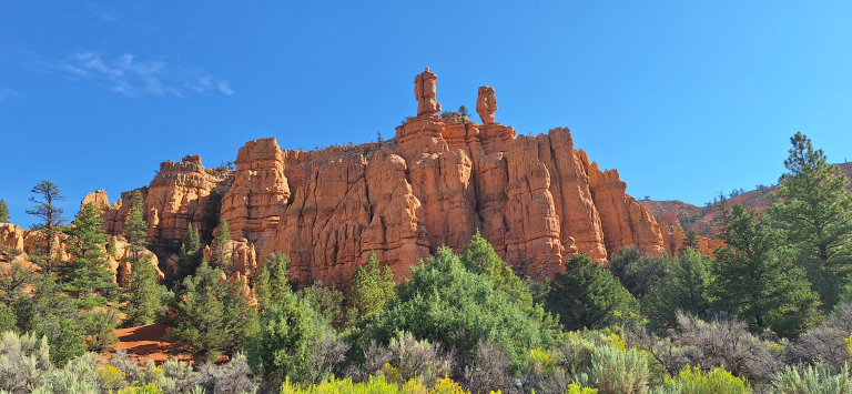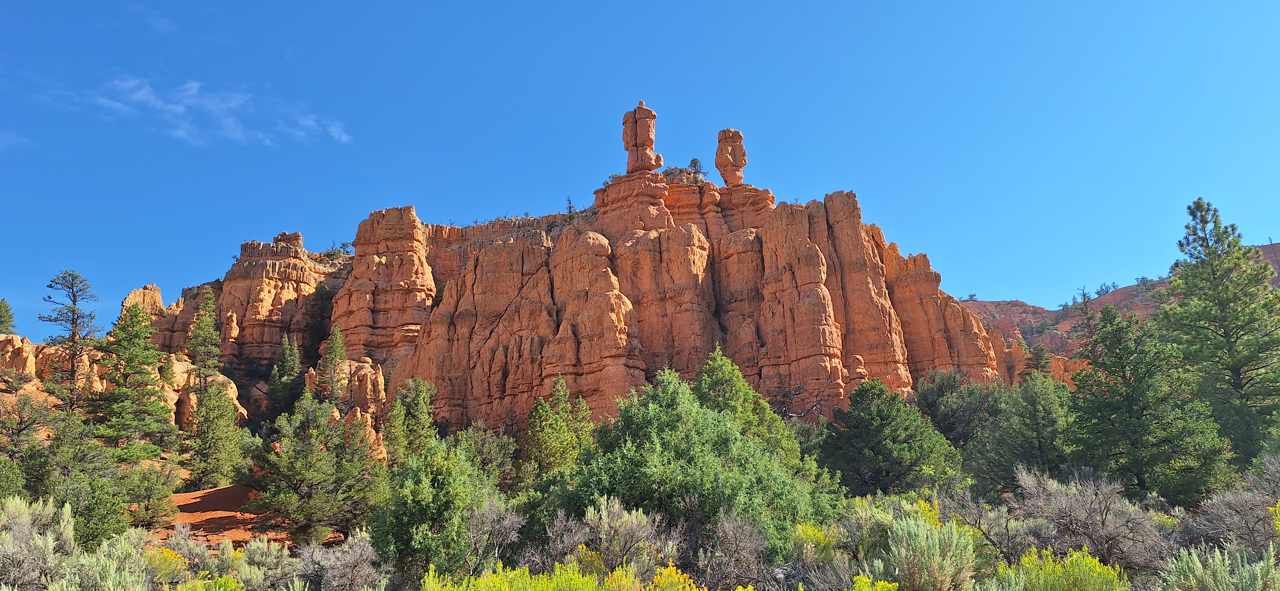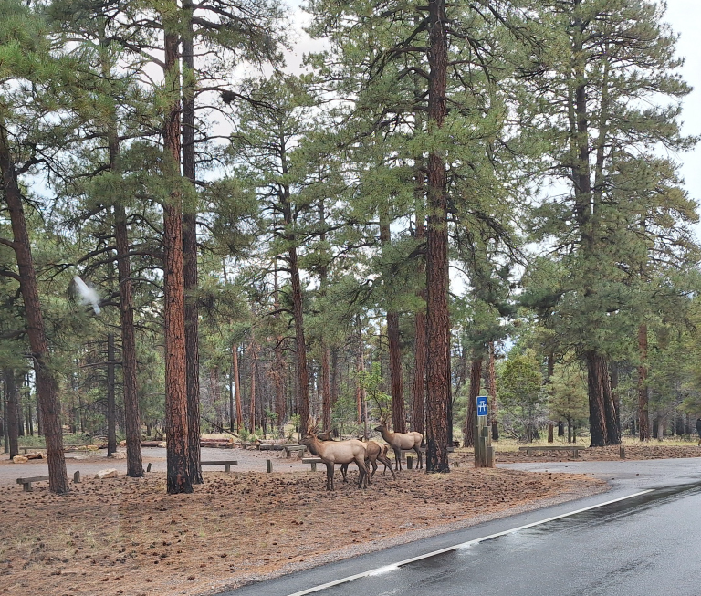 Wir machen mit dem frischen Licht des Tages nochmals eine Tour zum “Amphitheater”. Etwas weniger Wolken und das klare Licht haben sich gelohnt. Zurück auf das Plätzli zum Frühstücken (eigentlich nicht mehr früh), danach packen wir zusammen und vergessen prompt die Unterlegehölzer. Also wieder zurück, aber wir müssen sie suchen, die Reinigungsequipe hat sie schon im Müll entsorgt, nach 15 Minuten unserer Abfahrt… In Bryce City entdecken wir zwischen all den Motels und Hotels einen Waschsalon. Kurz entschlossen machen wir eine Waschpause. Es bleibt Zeit, dass geschehen im Ort zu beobachten. Der grösste Teil der Besucher übernachten ja hier und es ist schon erstaunlich was diese alles geboten bekommen! Casinos, Fressbeizen, Saloons und Souvenirshops ohne Ende. Ist das die Ruhe und Erholung in der schönen Natur? Das Angebot wird genutzt, gehört also wohl zum Erlebnis. Wir begnügen uns mit dem Red Canyon National Forest und bestaunen da die Hirschkühe.