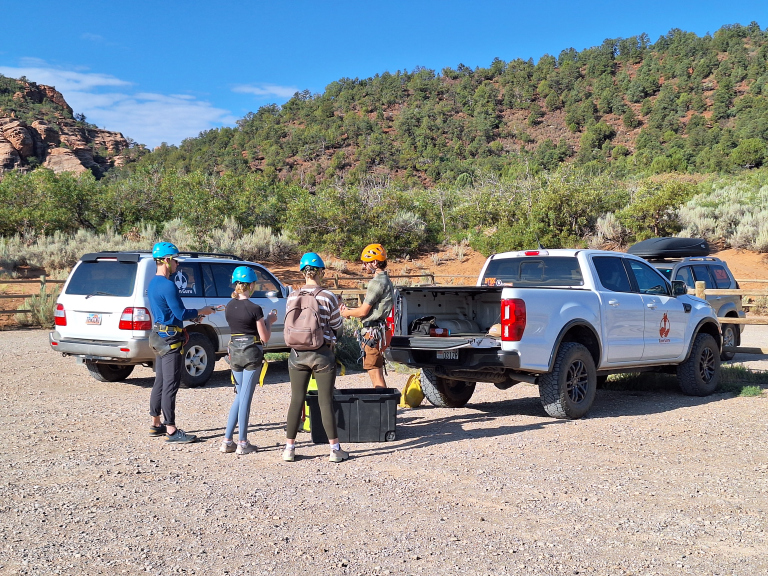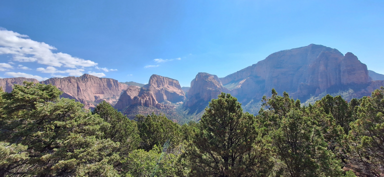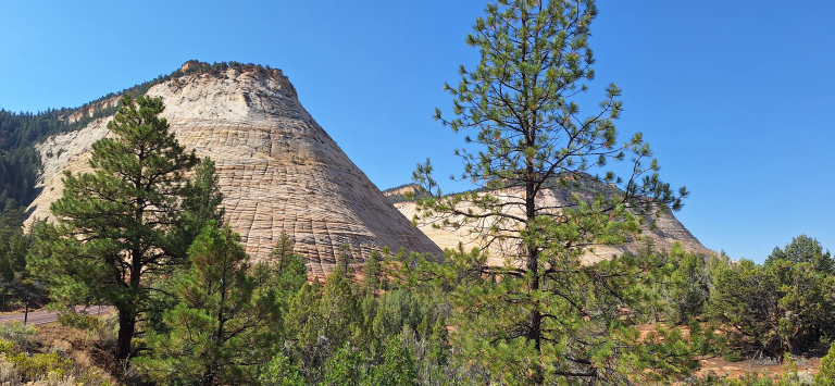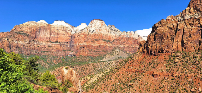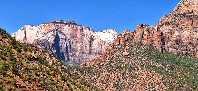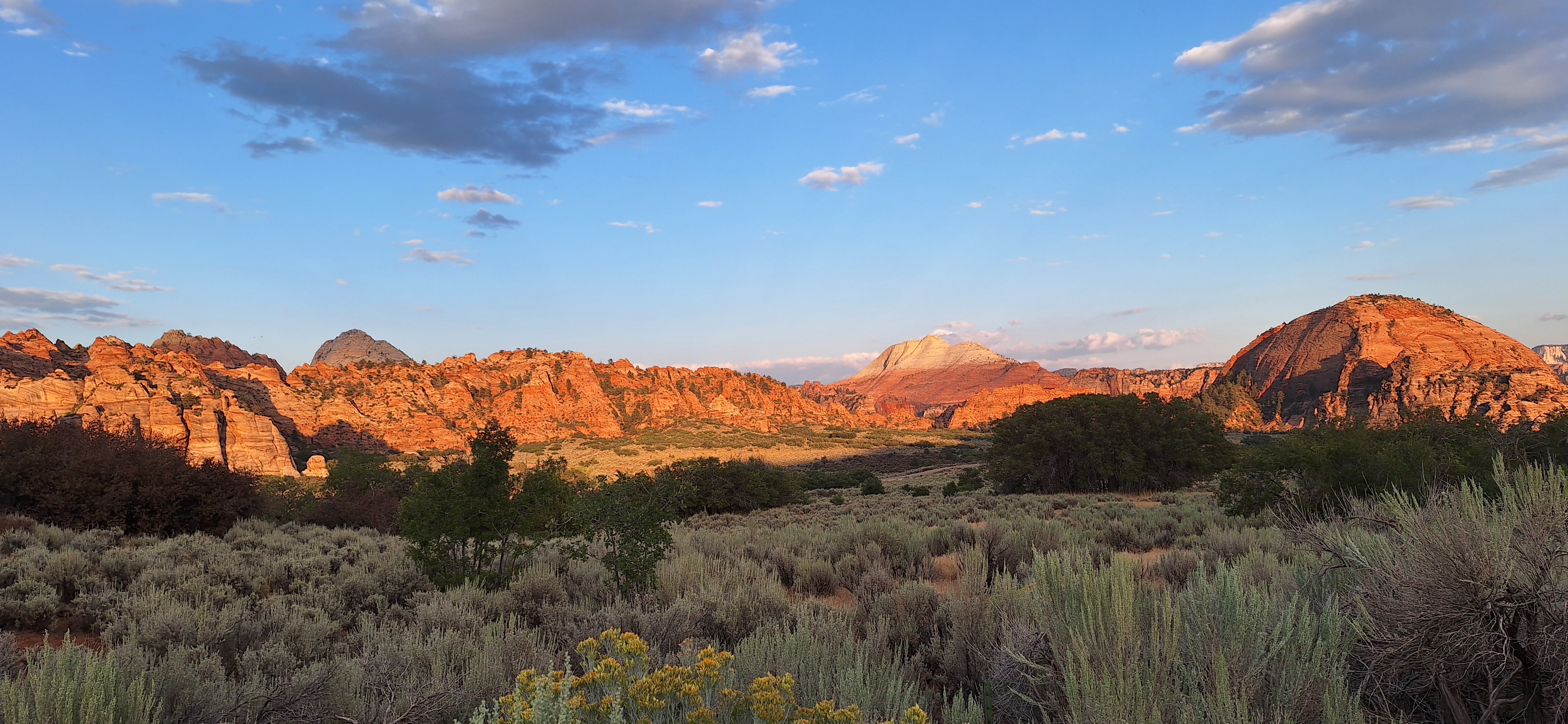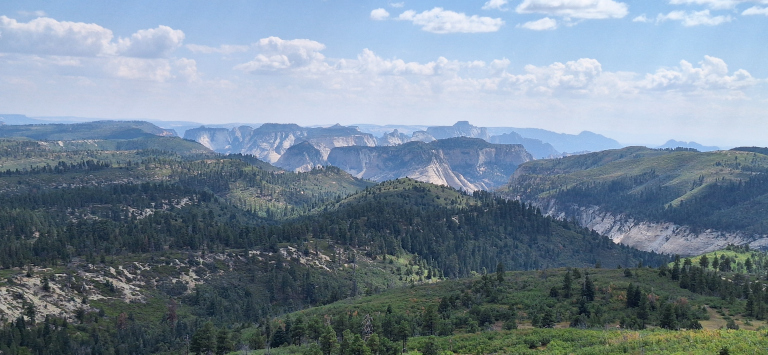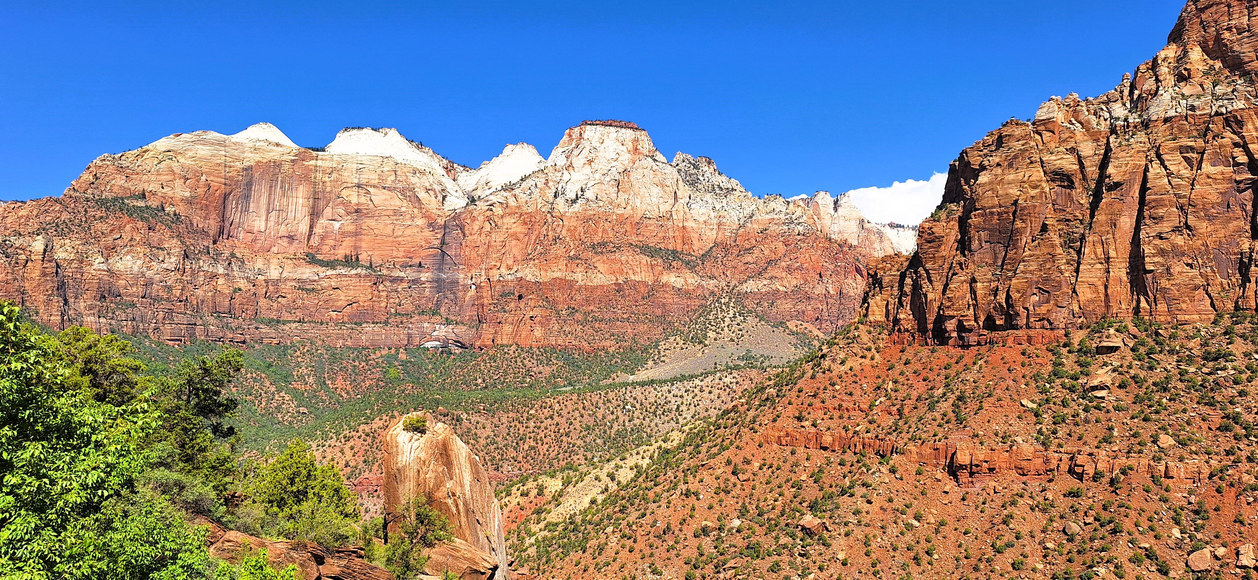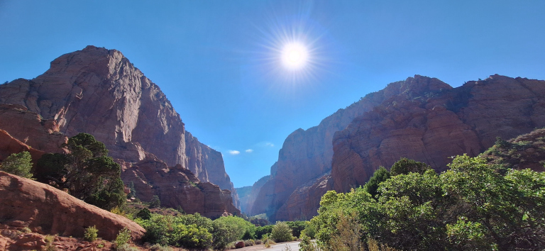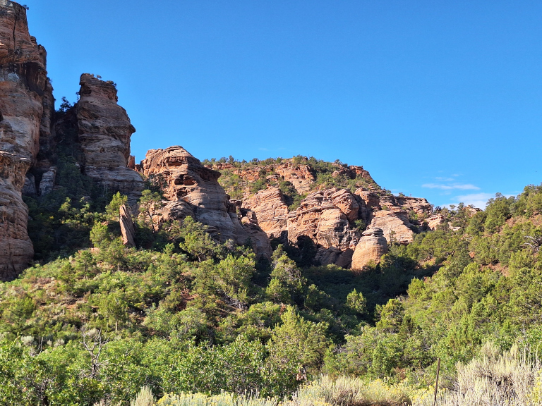 Zugegeben, der Samstag ist nicht der ideale Tag zum Besuch des Zion National Park. Erstaunlich, dass wir fast immer an einem Wochenende in einem der bekannten Parks Unterwegs sind. Wir müssen die Planung überdenken ;-) Von der Ostseite fahren wir in den Park und das ist ein grosser Vorteil. Hier, wo kein Interstate Highway vorbei führt, sind die Besucherströme noch erträglich. Und ja, ich wiederhole mich, die roten und weissen Schluchten sind etwas ganz tolles, es ist ein weiteres Geschenk der Natur an uns kleine Menschlein!!! Von der Westseite drängen eine unglaubliche Menge an Fahrzeugen in den Park. Das zentrale Tal im Park ist seit ein paar Jahren nur durch Gelenkbusse zugänglich. Die bringen die Leute eingepfercht wie Sardinen zu den Aussichtspunkten. Als wir das sehen ist für uns klar, so wollen wir die Felsenschluchten auf keinen Fall erleben, insbesondere da uns auch die eigene Gesundheit ein klein wenig im Stich lässt. Also fahren wir im Westen aus dem Park, um in Virgin auf einer Nebenstrasse auf die Kolob Terrace hinauf zu fahren. Diese Hochebene ist über den Schluchten des Parks. Von unten betrachtet auf dem Berg ;-) Die Anfahrt ist schön und Interessant, nur das mittlere Drittel führt durch den NP. Am Ende der Strasse erwartet uns das Kolob Basin, ein zur Zeit halb leerer Stausee. Er ist rege von Böötlifahrer und Badegästen besucht, für uns findet sich kein Plätzli für die Nacht. Auf dem Rückweg machen wir einen Fotohalt am Lava Point Overlook, dabei überblicken wir die weite Landschaft. Unmittelbar vor der Einfahrt in den NP ist ein Strässchen hinauf zur Lambs Knoll Klimbing Site. Unternehmer der Abenteuerbranche kommen hier hinauf und hängen an starken Seilen erlebnishungerige Touristen in die Felswände. Dazu wird ein guter Ausblick in die Felsenmassive des Zion NP geboten und wichtig für uns, dank des NF ist es möglich gratis zu Campen…