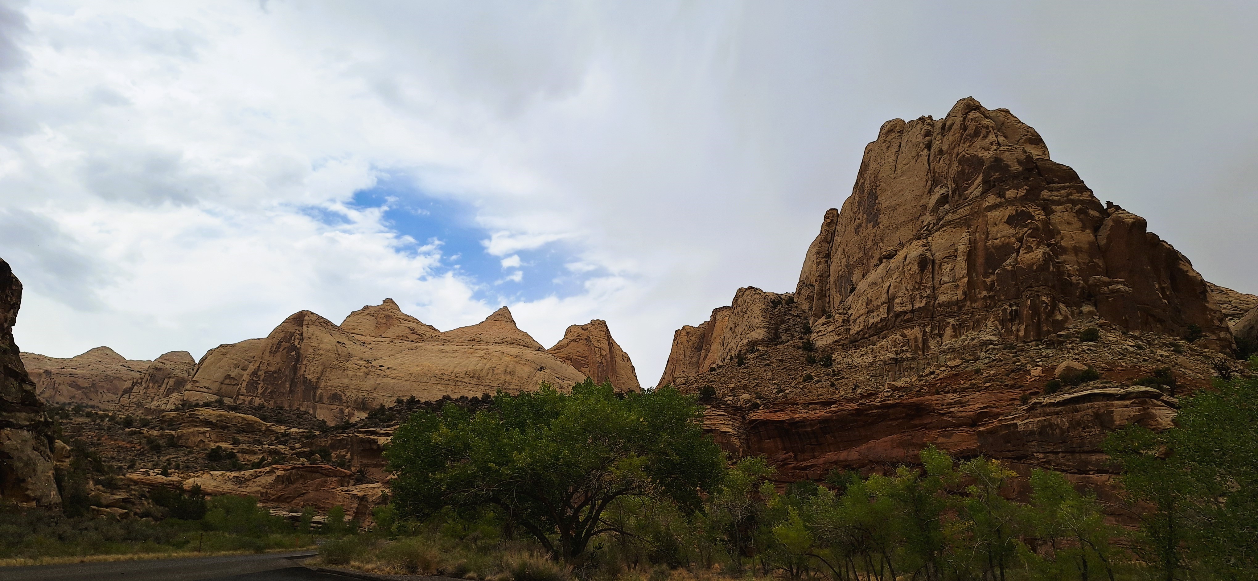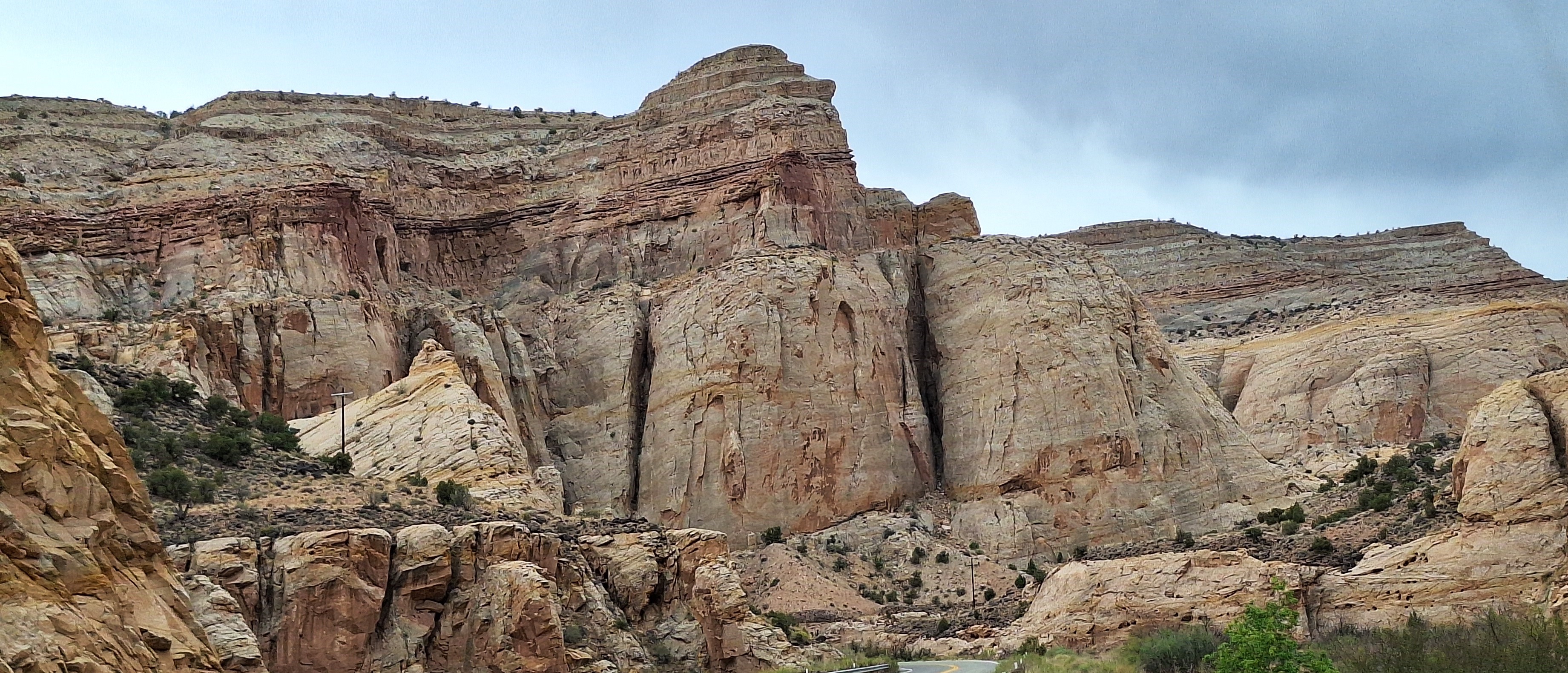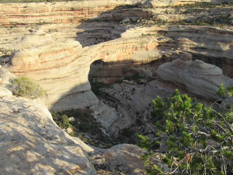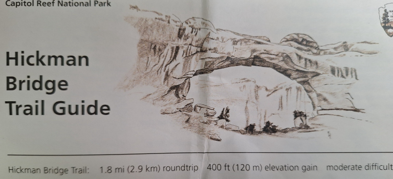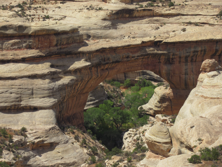 Um 7.00h machen wir uns auf um die zweitgrösste Naturbrücke in Nordamerika zu besuchen. Allen guten Vorsätzen zum Trotz, wir schaffen nur den halben Weg durch die Felsenwand hinunter und können einen eingeschränkten Blick auf die Sipapu Brücke werfen. Die Kachina Brücke bleibt für uns unerreichbar. Bei der Owachomo Brücke haben wir einen einfacheren Weg, so kommen wir bis in die Schlucht hinunter. Diese Brücke wurde als erste 1883 entdeckt und es gibt noch viele Fotos, wo Handstände gezeigt und Cowboys Pferde steigen lassen und den Schlund überqueren. Um ca. 1970 ist ein grosser, unterer Teil des Felsens weggebrochen und es ist abzusehen, dass sie ganz einstürzen wird. Der Aufstieg führte uns aus dem Schluchtenschatten, es wurde schnell sehr warm! Auf Schautafeln wird einem auch die Geologie näher gebracht. Die Felsen im Natural Bridges National Park sind z.B. 180 Mio. Jahre älter als im Arches NP, dessen rotes Gestein aus der Jurazeit stammt. Präsident Theodor Roosevelt erklärte 1908 die Brücken zum Monument der USA. Weiter durch typische Wüste, über den Highway 95, entlang des Withe Canyon, kommen wir an den Colorado River. Hier, wo der Dirty Devil River einmündet, hatte auch der Entdecker und Kartograf Powell ein Camp. Er berichtete als erster von den eindrücklichen Felsenschluchten entlang dieser Gewässer. Beim Ort Hanksville wechseln wir auf den Highway 24 und erreichen schon bald die ersten Felsenformationen des Capitol Reef National Park. Wegen Überfüllung müssen wir den Park durchqueren und in einem Overflow Camp ausserhalb des Parks nächtigen. Erstaunlich, 2 Stunden später sind wir schon zu acht hinter den Büschen.