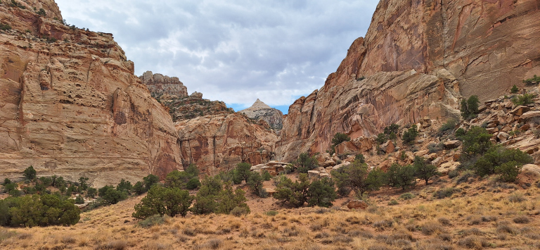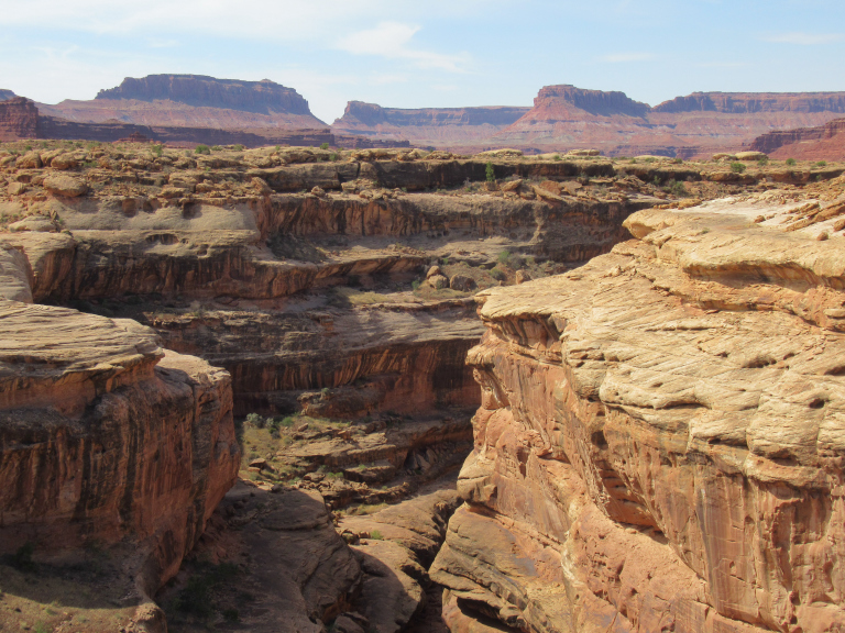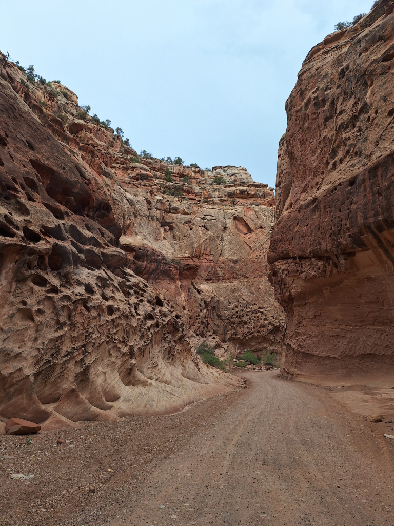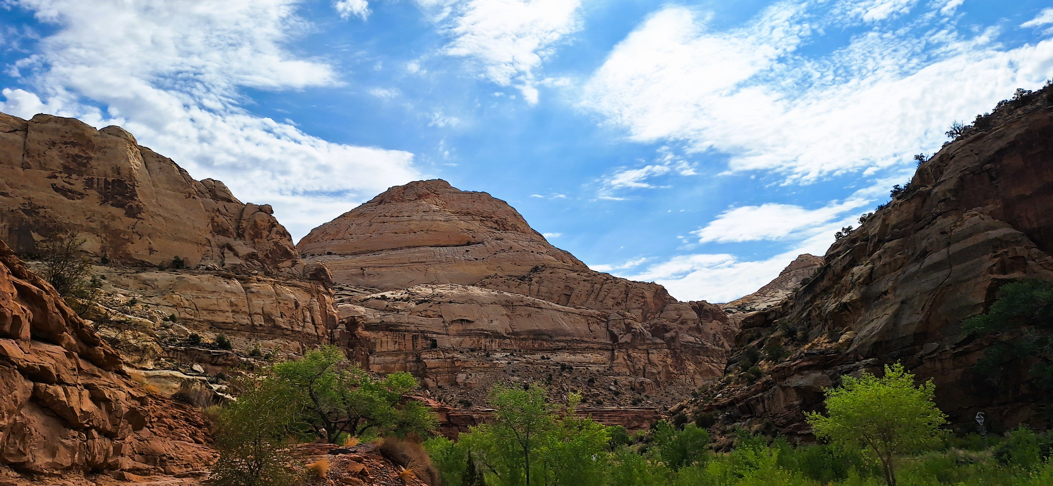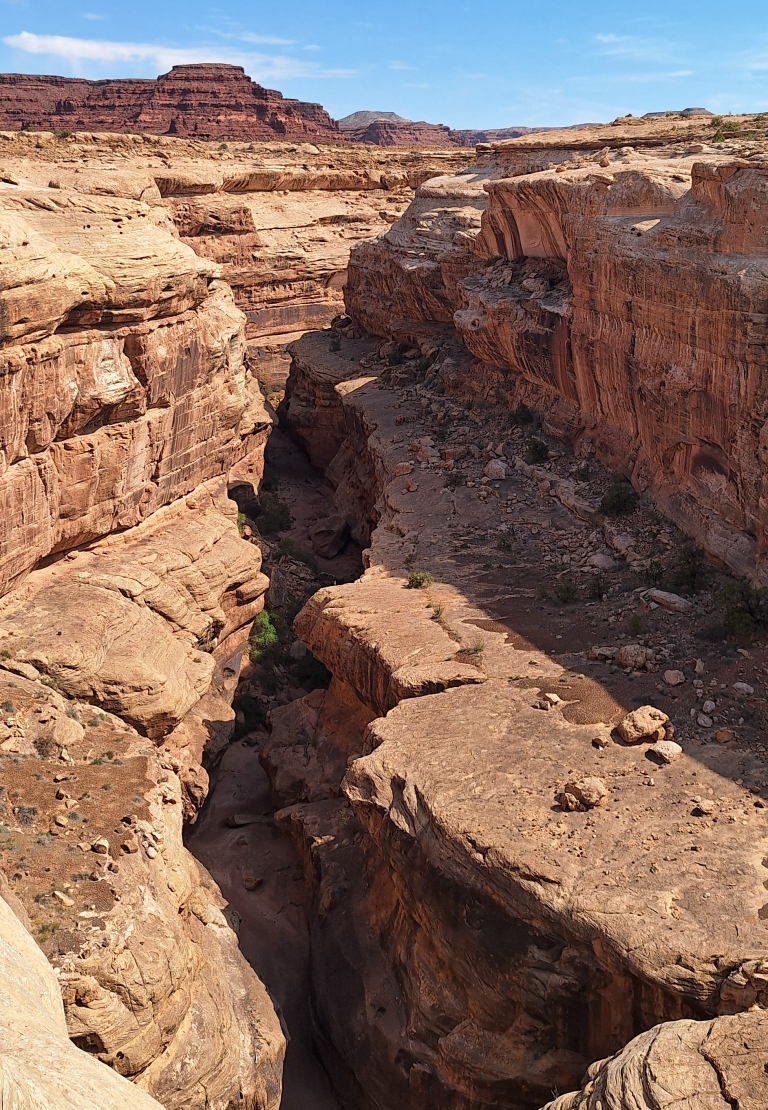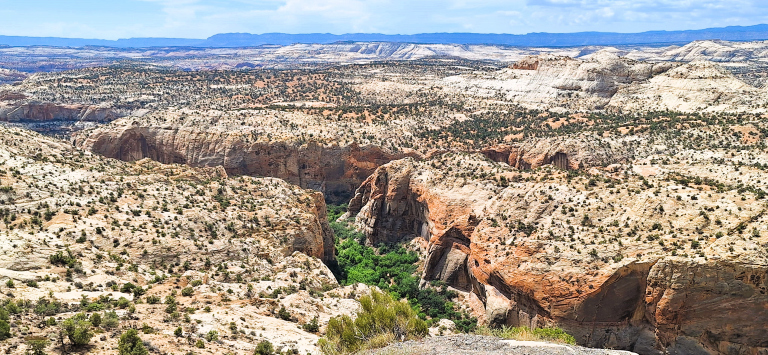 Um 7.00h machen wir uns auf um die zweitgrösste Naturbrücke in Nordamerika zu besuchen. Allen guten Vorsätzen zum Trotz, wir schaffen nur den halben Weg durch die Felsenwand hinunter und können einen eingeschränkten Blick auf die Sipapu Brücke werfen. Die Kachina Brücke bleibt für uns unerreichbar. Bei der Owachomo Brücke haben wir einen einfacheren Weg, so kommen wir bis in die Schlucht hinunter. Diese Brücke wurde als erste 1883 entdeckt und es gibt noch viele Fotos, wo Handstände gezeigt und Cowboys Pferde steigen lassen und den Schlund überqueren. Um ca. 1970 ist ein grosser, unterer Teil des Felsens weggebrochen und es ist abzusehen, dass sie ganz einstürzen wird. Der Aufstieg führte uns aus dem Schluchtenschatten, es wurde schnell sehr warm! Auf Schautafeln wird einem auch die Geologie näher gebracht. Die Felsen im Natural Bridges National Park sind z.B. 180 Mio. Jahre älter als im Arches NP, dessen rotes Gestein aus der Jurazeit stammt. Präsident Theodor Roosevelt erklärte 1908 die Brücken zum Monument der USA. Weiter durch typische Wüste, über den Highway 95, entlang des Withe Canyon, kommen wir an den Colorado River. Hier, wo der Dirty Devil River einmündet, hatte auch der Entdecker und Kartograf Powell ein Camp. Er berichtete als erster von den eindrücklichen Felsenschluchten entlang dieser Gewässer. Beim Ort Hanksville wechseln wir auf den Highway 24 und erreichen schon bald die ersten Felsenformationen des Capitol Reef National Park. Wegen Überfüllung müssen wir den Park durchqueren und in einem Overflow Camp ausserhalb des Parks nächtigen. Erstaunlich, 2 Stunden später sind wir schon zu acht hinter den Büschen.