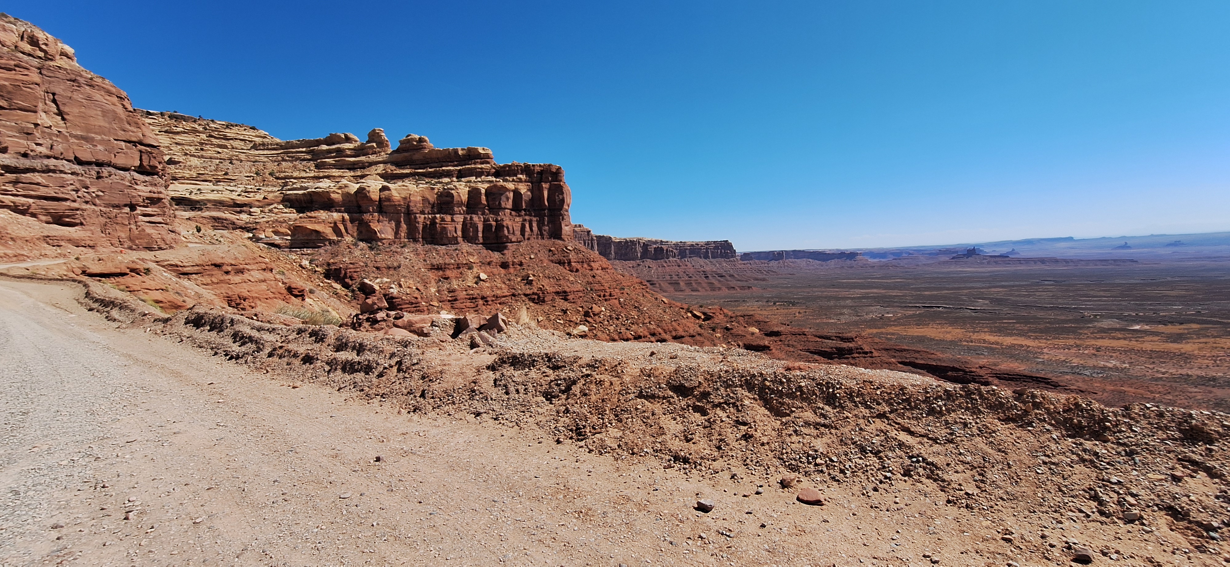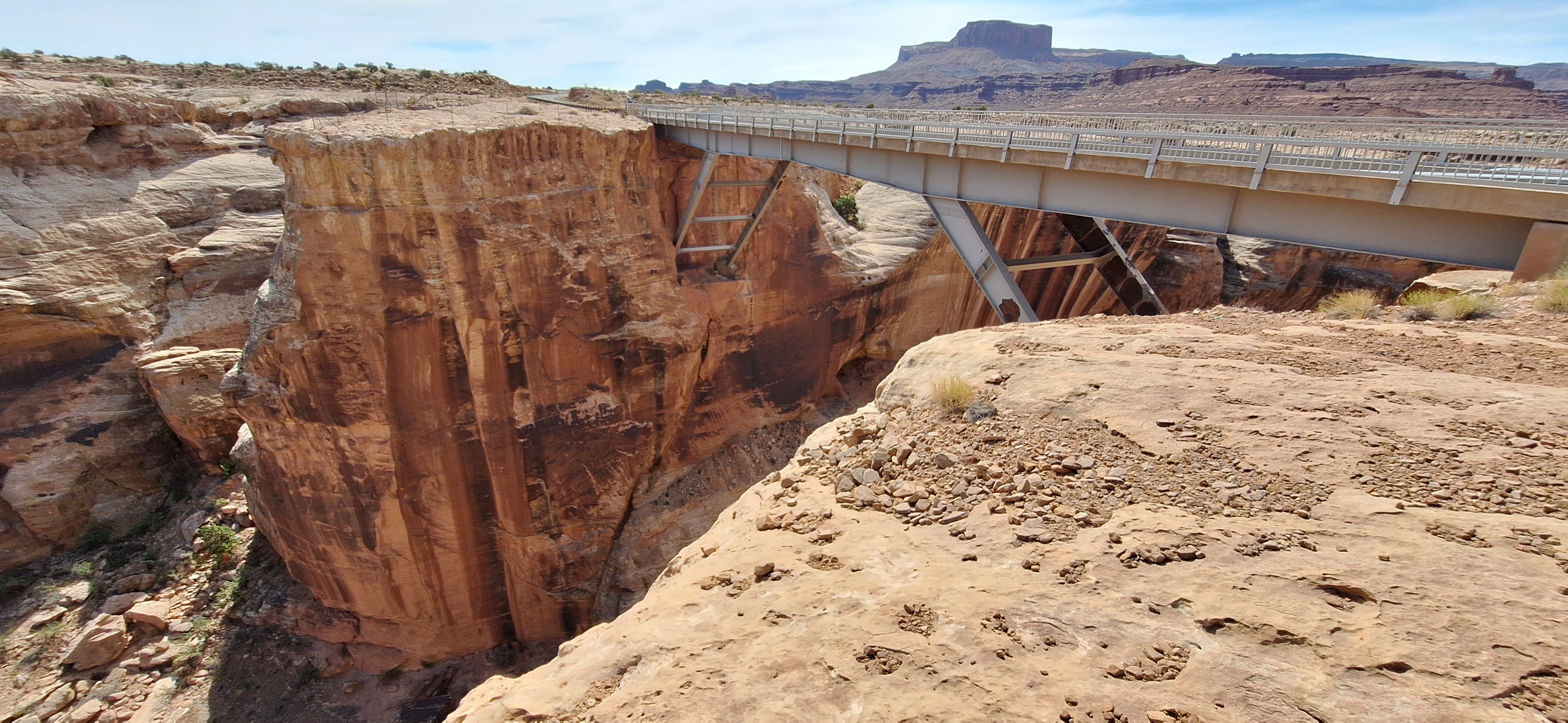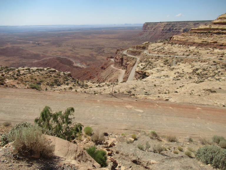 Es hat sich gelohnt, durch die Nacht werden wir von Grillengezirpe unterhalten, es kommen Hirsche zu Besuch die ein paar Fliegen mitbringen. Das freut wiederum die Fledermäuse und die prächtigen Eidechsen, die uns beim Frühstück zuschauen. Danach geht es zum tollen Aussichtspunkt am Goosenecks State Park. Extrem wie der San Juan River sich durch das Felsengestein schlängelt! Der Highway 261 führt uns auf eine ausgedehnte Hochebene, direkt auf ein Felsenmassiv von 200 Meter zu. Unzählige Schilder an der Strasse warnen vor den kommenden Gefahren beim befahren der Piste durch die Felsenwand. OK, mit einem Sattelschlepper, die verboten sind, hätte man tatsächlich Probleme. Die Geschwindigkeit ist so begrenzt, dass auch der letzte Tourist die Gefahr bemerkt, und ja, es ist eindrücklich durch die Felsenwand! Von oben belohnt ein toller Blick zurück! Bei der Ankunft im Natural Bridges National Park ist es wieder einmal sehr heiss. So beschränken wir uns auf eine Rundfahrt zu den Naturbrücken und buchen im Park einen Campground.