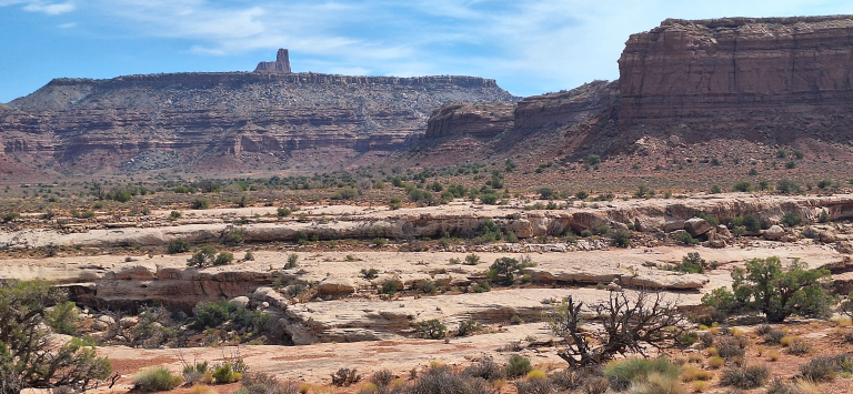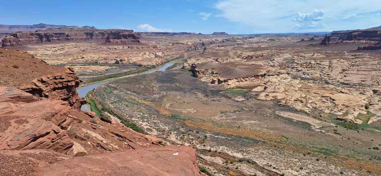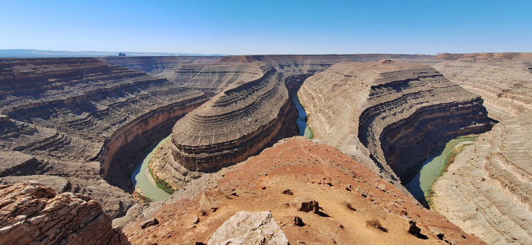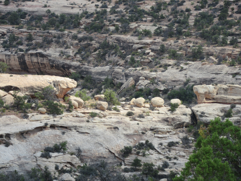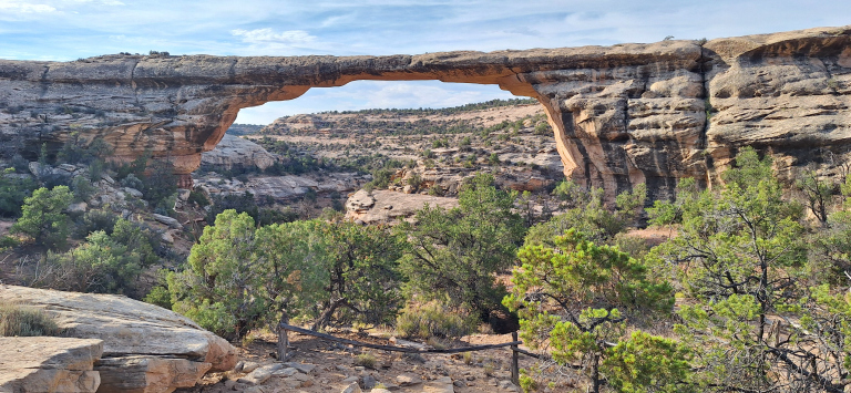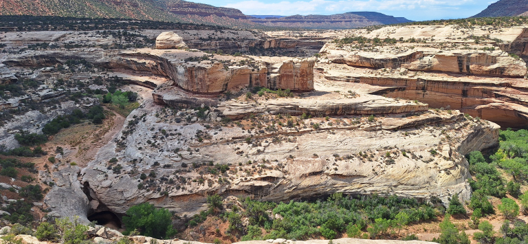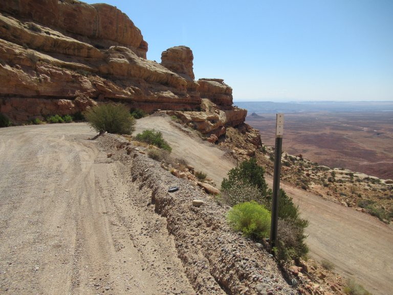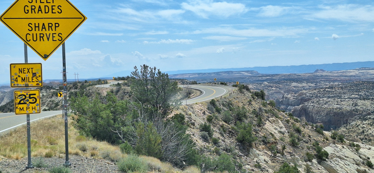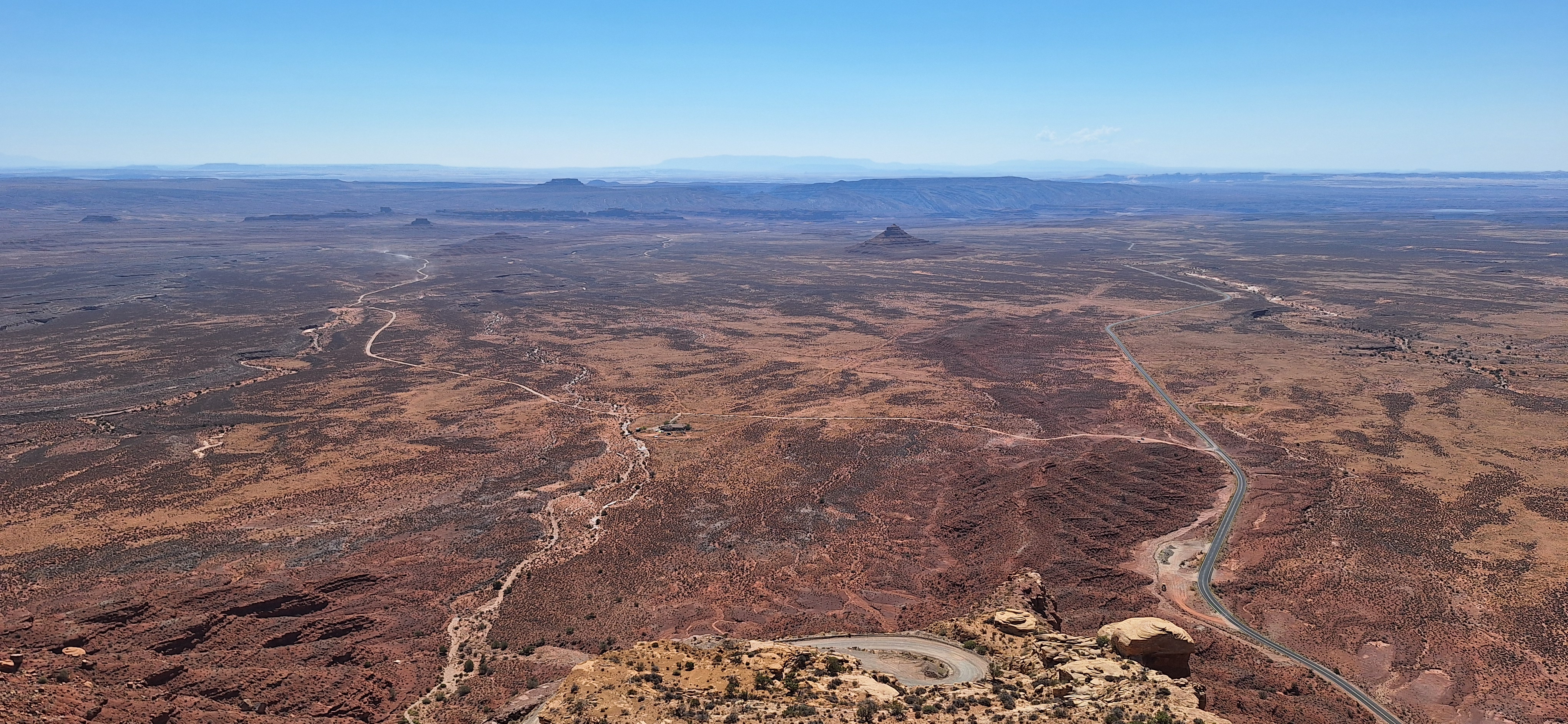 Es hat sich gelohnt, durch die Nacht werden wir von Grillengezirpe unterhalten, es kommen Hirsche zu Besuch die ein paar Fliegen mitbringen. Das freut wiederum die Fledermäuse und die prächtigen Eidechsen, die uns beim Frühstück zuschauen. Danach geht es zum tollen Aussichtspunkt am Goosenecks State Park. Extrem wie der San Juan River sich durch das Felsengestein schlängelt! Der Highway 261 führt uns auf eine ausgedehnte Hochebene, direkt auf ein Felsenmassiv von 200 Meter zu. Unzählige Schilder an der Strasse warnen vor den kommenden Gefahren beim befahren der Piste durch die Felsenwand. OK, mit einem Sattelschlepper, die verboten sind, hätte man tatsächlich Probleme. Die Geschwindigkeit ist so begrenzt, dass auch der letzte Tourist die Gefahr bemerkt, und ja, es ist eindrücklich durch die Felsenwand! Von oben belohnt ein toller Blick zurück! Bei der Ankunft im Natural Bridges National Park ist es wieder einmal sehr heiss. So beschränken wir uns auf eine Rundfahrt zu den Naturbrücken und buchen im Park einen Campground.