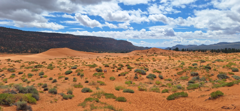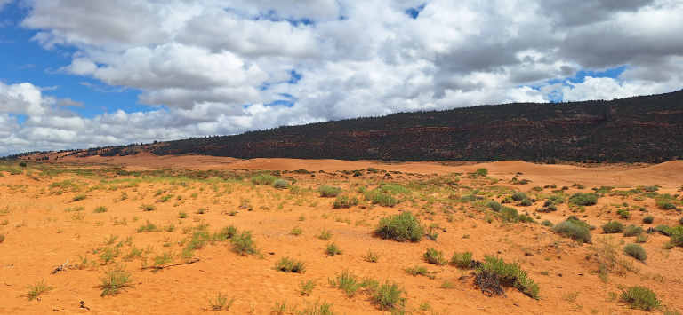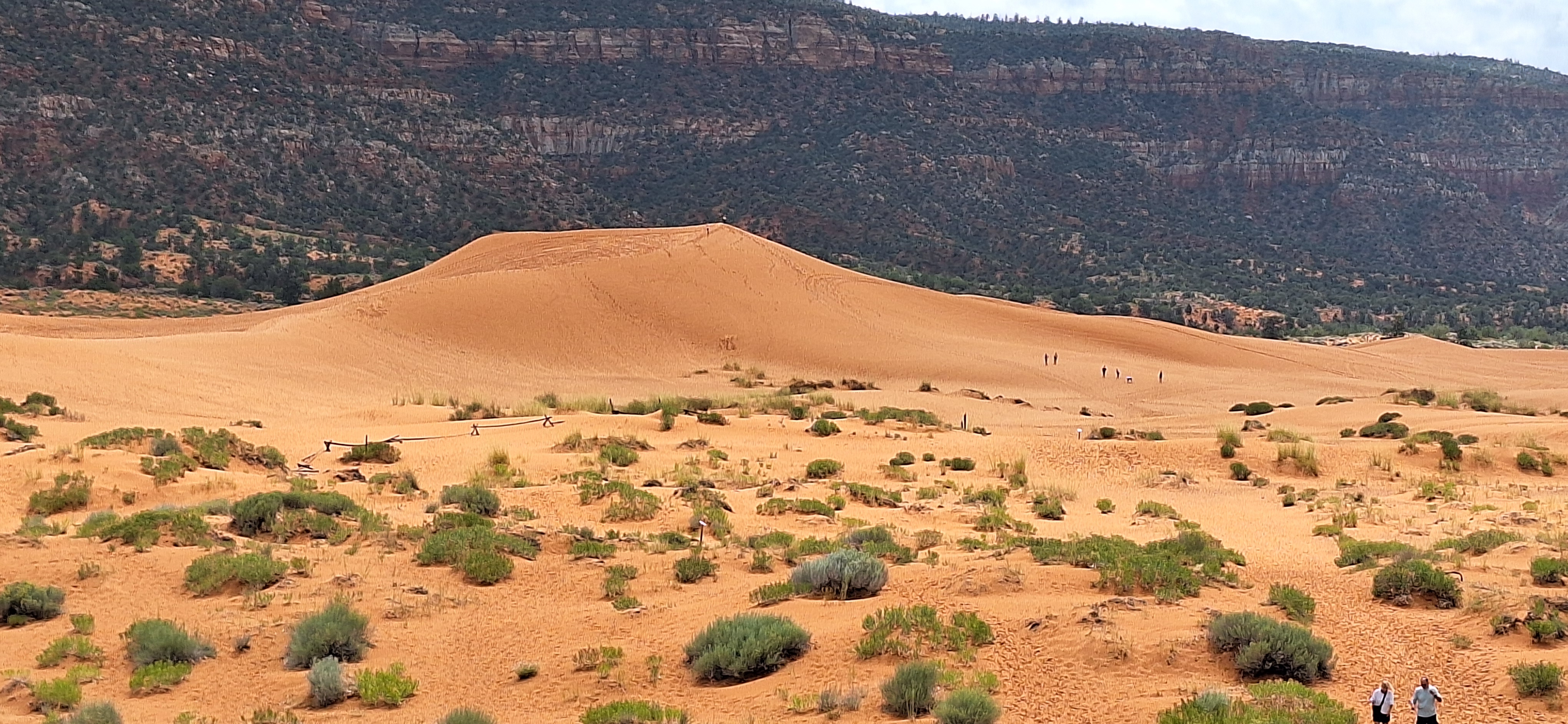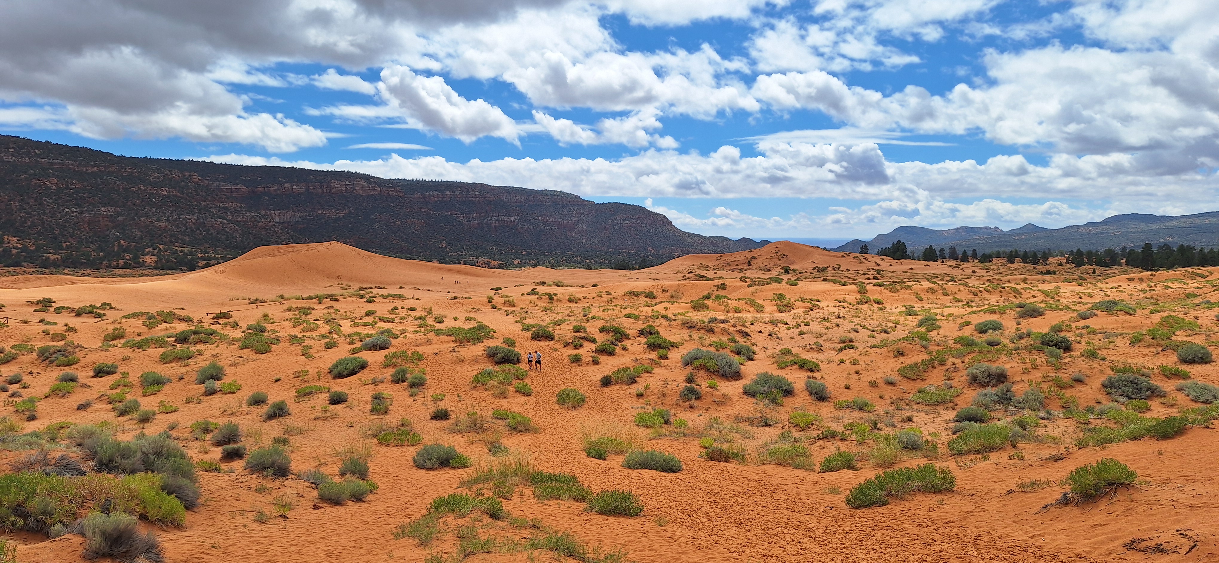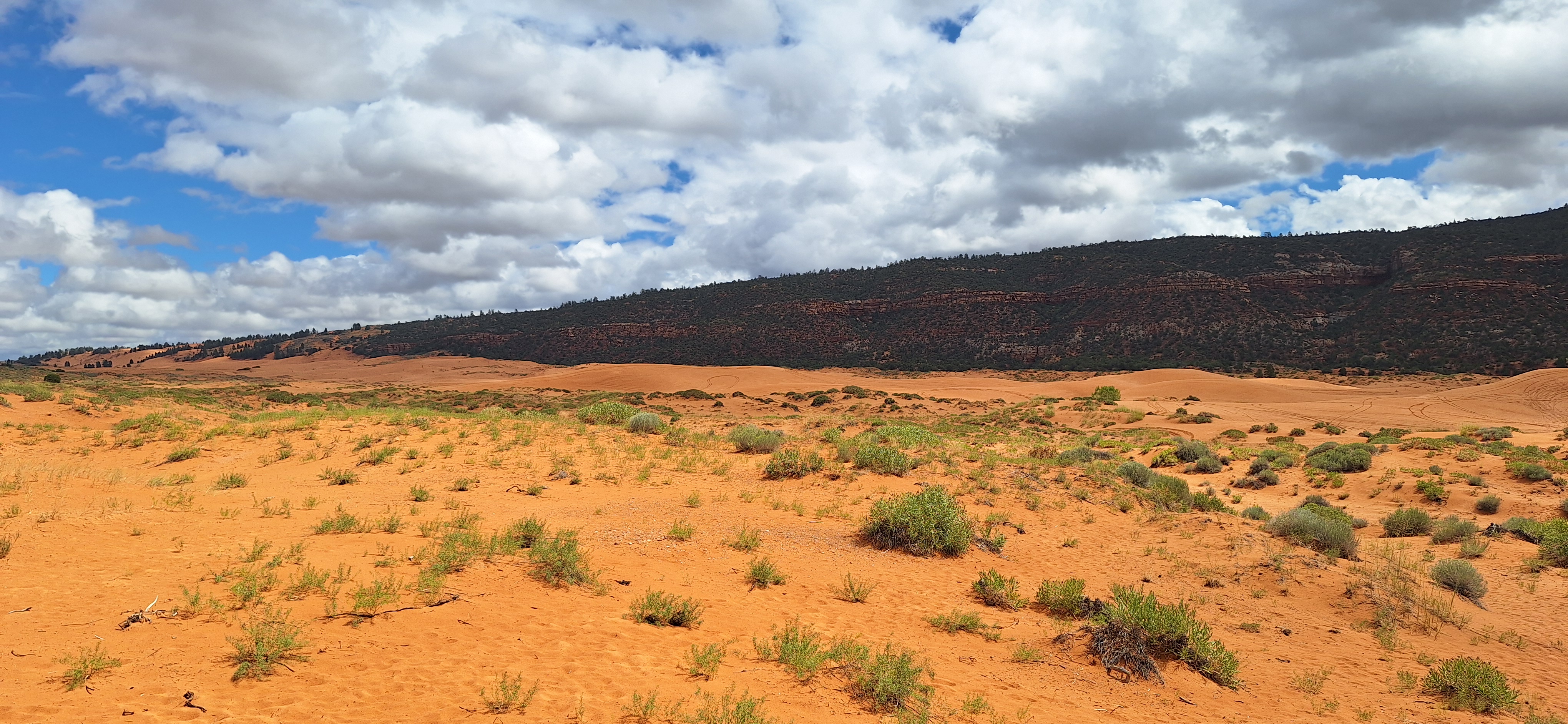 Wir kommen am Cedar Breaks National Monument vorbei und können nochmals Felsenformationen ähnlich dehnen im Bryce Canyon NP bestaunen. Durch Alpines Hochland, (3'100m) bringt uns die 14er zum Duck Stausee und an den Highway 89 zurück. Jetzt geht es nach Süden, über Mount Carmel, entlang der Vermillion Cliffs in den Coral Pink Sand Dunes State Park. Hier zeigt Utha Park recht schöne, zum Teil locker mit Pinien bewachsene Sanddünen. Leider sind im Park alle Geländefahrzeuge zugelassen, die in Utha erlaubt sind. Am meisten stören die Motocross Motorräder mit ihren kreischenden Motoren, da fliegt der rote Sand ganz schön durch die Gegend. Wir geniessen die gute Infrastruktur des Parks.