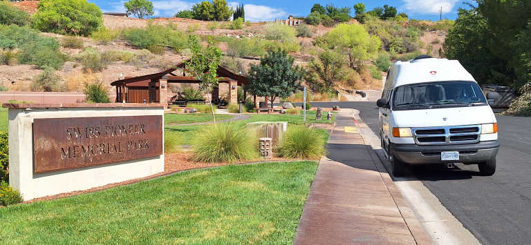 Bei Gunlock fahren wir wieder einmal hinunter in ein Tal, da können wir versteinerte Sanddünen bewundern. Es ist aber um 40°C, also nicht sehr einladend um die Wanderwege zu benützen. Obschon tatsächlich vereinzelte der Hitze trotzen. In Santa Clara, einem sehr gepflegten Städtchen mit grünem Rasengolfplatz mitten in der Wüste, kommen wir ins staunen. Im Zentrum treffen wir zufällig auf den “Swiss Memorial Park”. 1856 haben sich etwa 20 Mormonenfamilien aus der Schweiz hier niedergelassen und ein kleines, bewässertes Paradies geschaffen. Die typischen Namen, Gerber, Graf etc. sind immer noch auf Geschäften sichtbar. Über das geschäftige Saint George fahren wir wieder in den Corral Pink Sand State Park. Wegen dem heutigen Labor Day ist kaum mehr ein Plätzli zu finden. Langsam beginnen wir mit arbeiten um unseren Dodgli zu Überwintern.